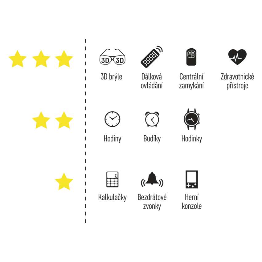 Knoflíkové baterie CR2016, CR2025 a CR2032 obsahují lithium, díky kterému vás nikdy nezklamou. Levné alkalické „knoflíky“ tak jednoznačně převyšují svým maximálním výkonem, dvojnásobným napětím (3 V), stabilním za jakkoli extrémních podmínek, a abnormálně dlouhou životností (10 let). Vzhledem k tomu nachází uplatnění v běžném životě (jako knoflíkové baterie do hodinek nebo do naslouchadel) i v náročných plánech vrcholových sportovců a nevyléčitelných dobrodruhů (jako externí baterie na které je spoleh).