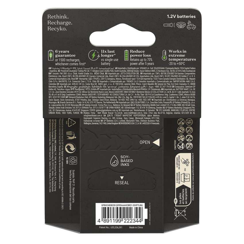 Společnost GP se nezaměřuje pouze na výrobu špičkových výrobků, ale aktivně hledá způsoby, jak snížit ekologický dopad svých produktů a jejich obalů. Jejich inovativní řada dobíjecích baterií a nabíječek s názvem Recyko Pro je příkladem této snahy. Tyto produkty jsou baleny v papírových obalech, které neobsahují žádné plasty. Tím podporují používání recyklovaných materiálů a snižují množství odpadu. S těmito obaly šetrnými k naší planetě můžete být součástí pozitivní změny i vy! Přispějte ke snižování ekologické zátěže.