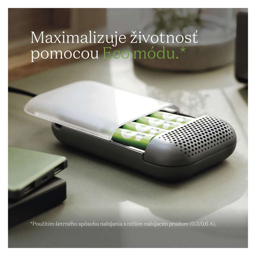 Nabíjačka Recyko Charge 10 bola vyvinutá na rýchle nabíjanie batérií, ktoré sú na to určené. Je však vybavená aj špeciálnym režimom ECO, ktorý šetrne nabíja všetky typy batérií AA a AAA NiMH bez ich poškodenia. Nabíjačka Recyko Charge 10 sa tak stane vašou univerzálnou nabíjačkou pre všetky príležitosti.